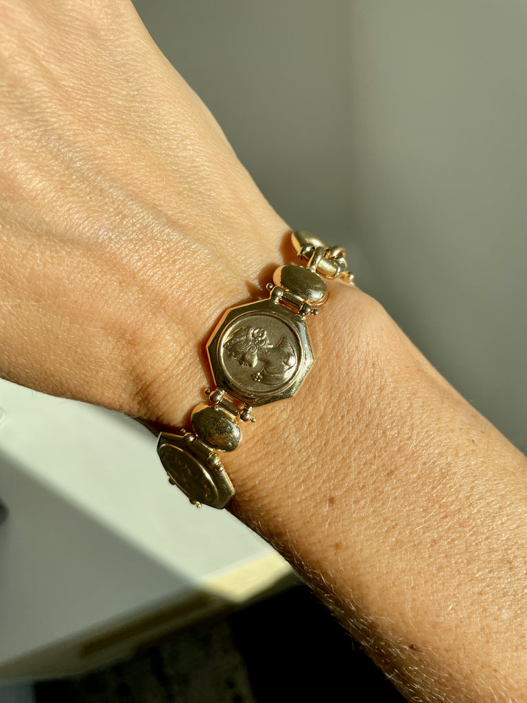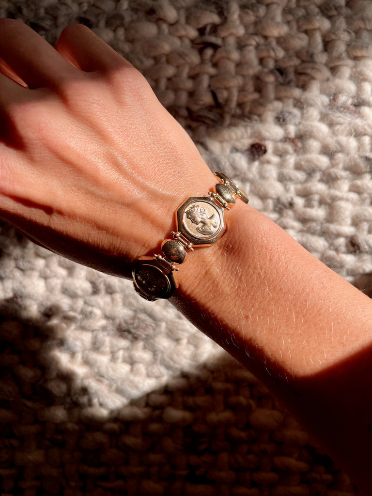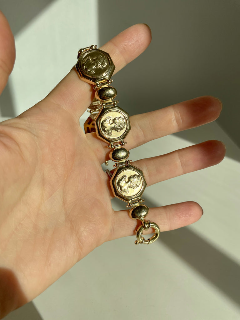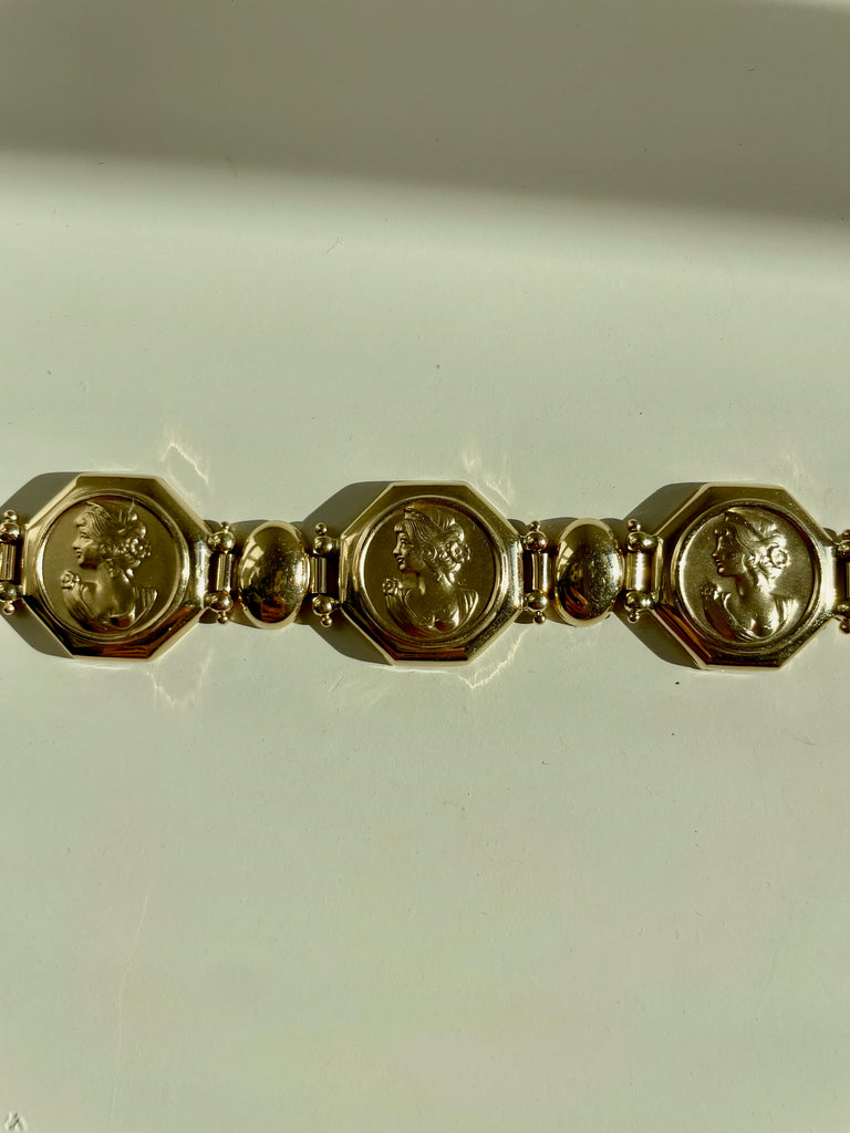 I love what a great statement this Italian 14k cameo bracelet makes! I love the geometric shapes with the classic images paired with the big spring clasp! It is a great piece - effortlessly cool, elevated and easy to wear!