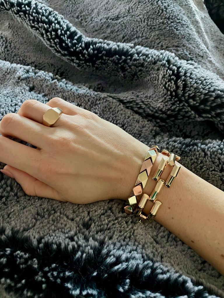 This gorgeous bracelet is made of alternating links of 14k yellow and rose gold - each link is faceted to catch all of the light. This bracelet is unique and beautiful on its own, but I have to say I think it really stands out in a stack. It is modern, cool and interesting! I love to mix metals, and this bracelet is such a great way to pull some rose gold into your look.