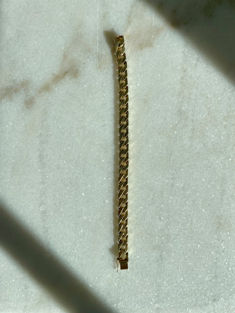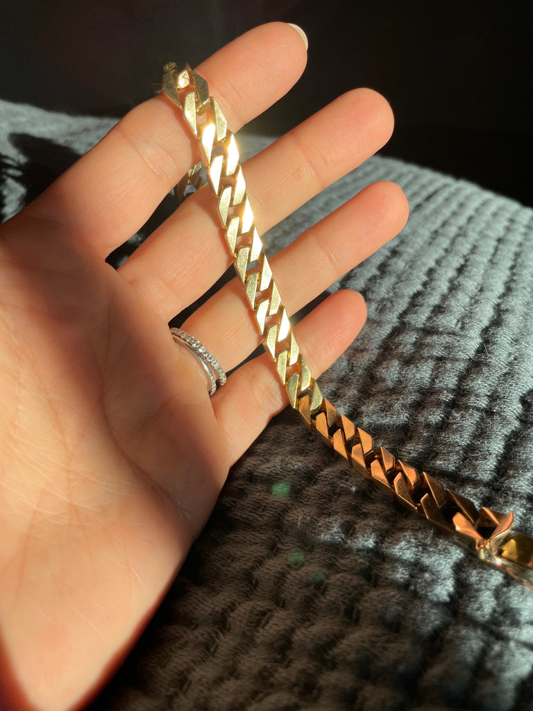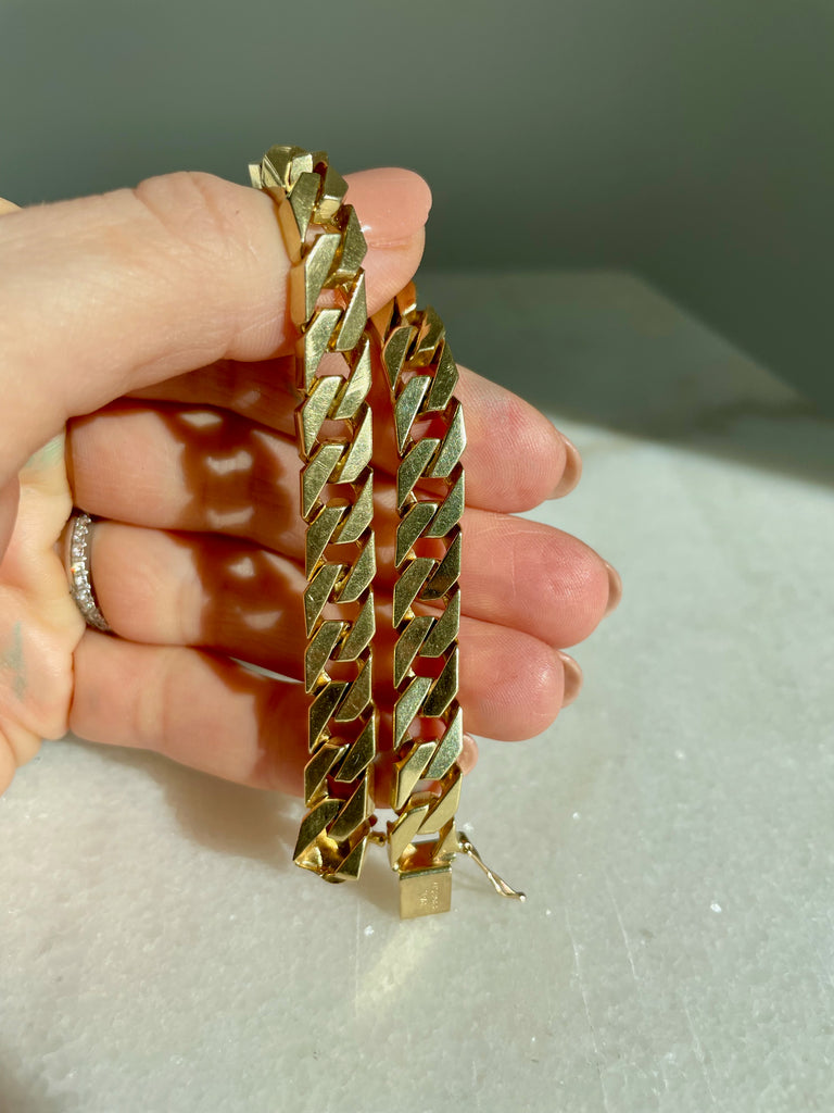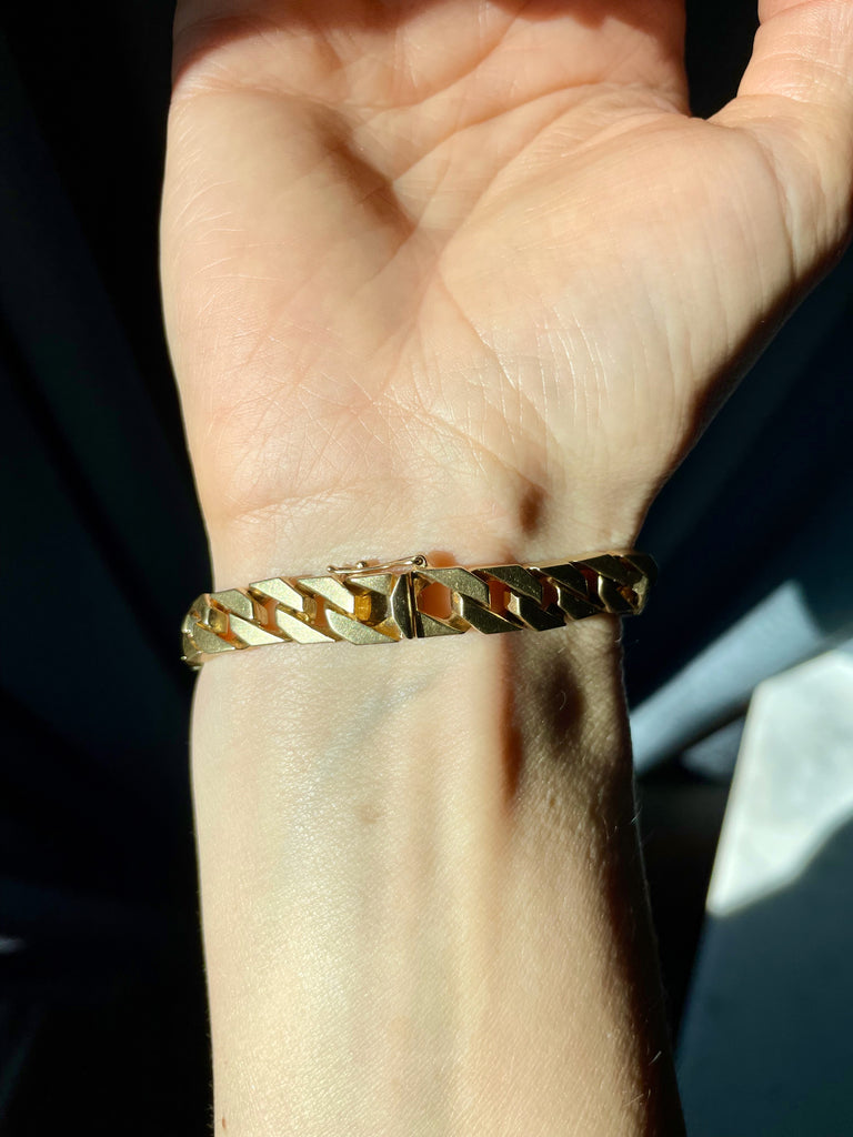 This bracelet is everything. I am listing it but it will be a tough one to part with because I am absolutely in love with it. The links are so angular and beautiful, it is thick, and it feels AMAZING on your wrist. I cannot say enough good things about it. It looks amazing alone or stacked - basically you will never want to take it off and you will feel comfortable wearing it wherever you go because it has a secure push clasp and a safety clasp for added security.