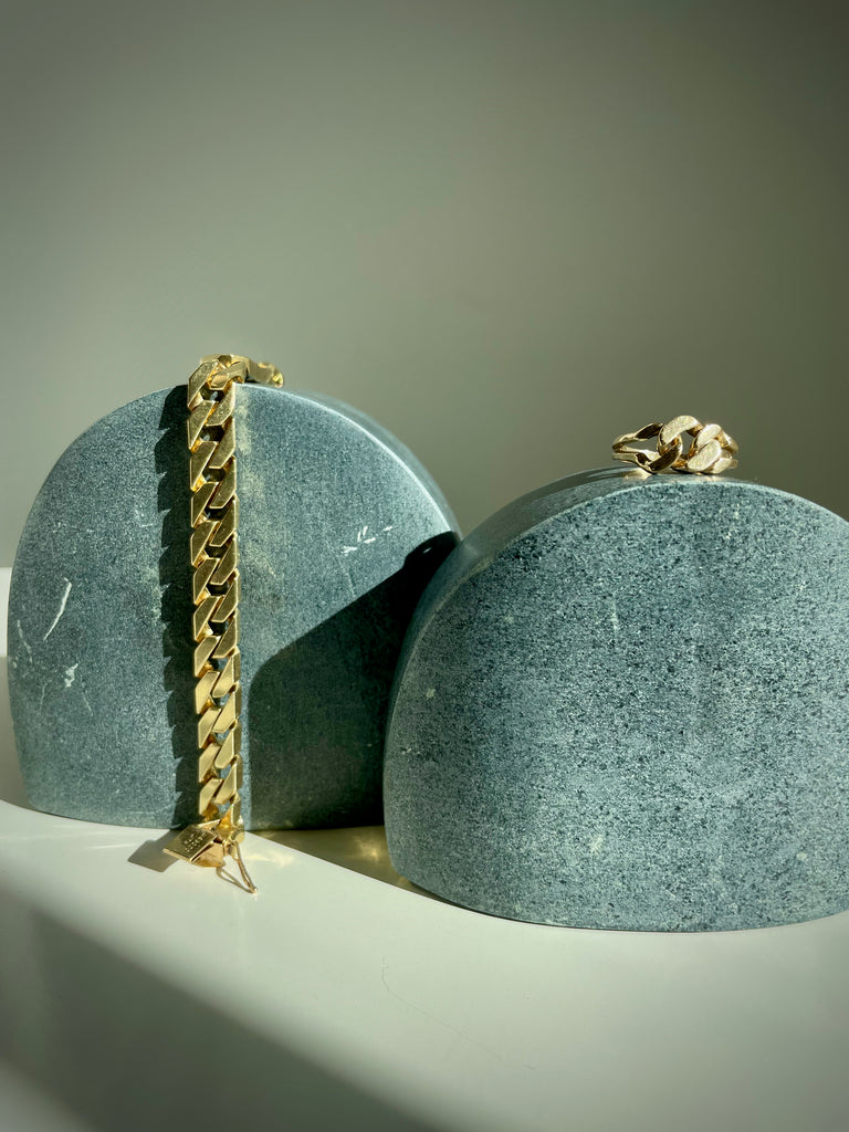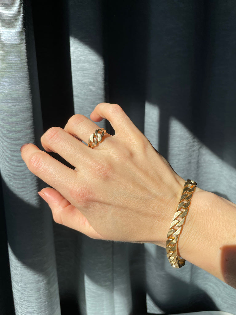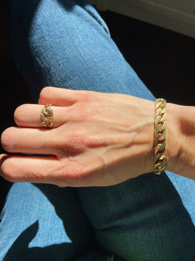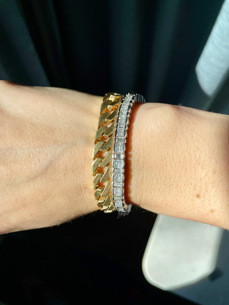 This bracelet is everything. I am listing it but it will be a tough one to part with because I am absolutely in love with it. The links are so angular and beautiful, it is thick, and it feels AMAZING on your wrist. I cannot say enough good things about it. It looks amazing alone or stacked - basically you will never want to take it off and you will feel comfortable wearing it wherever you go because it has a secure push clasp and a safety clasp for added security.