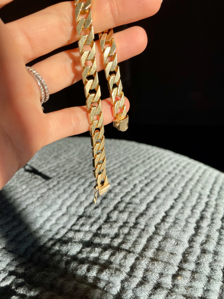 14k, 38.95g, links are 8.2mm wide and 3.2mm thick and 7.5” long (can be shortened easily).