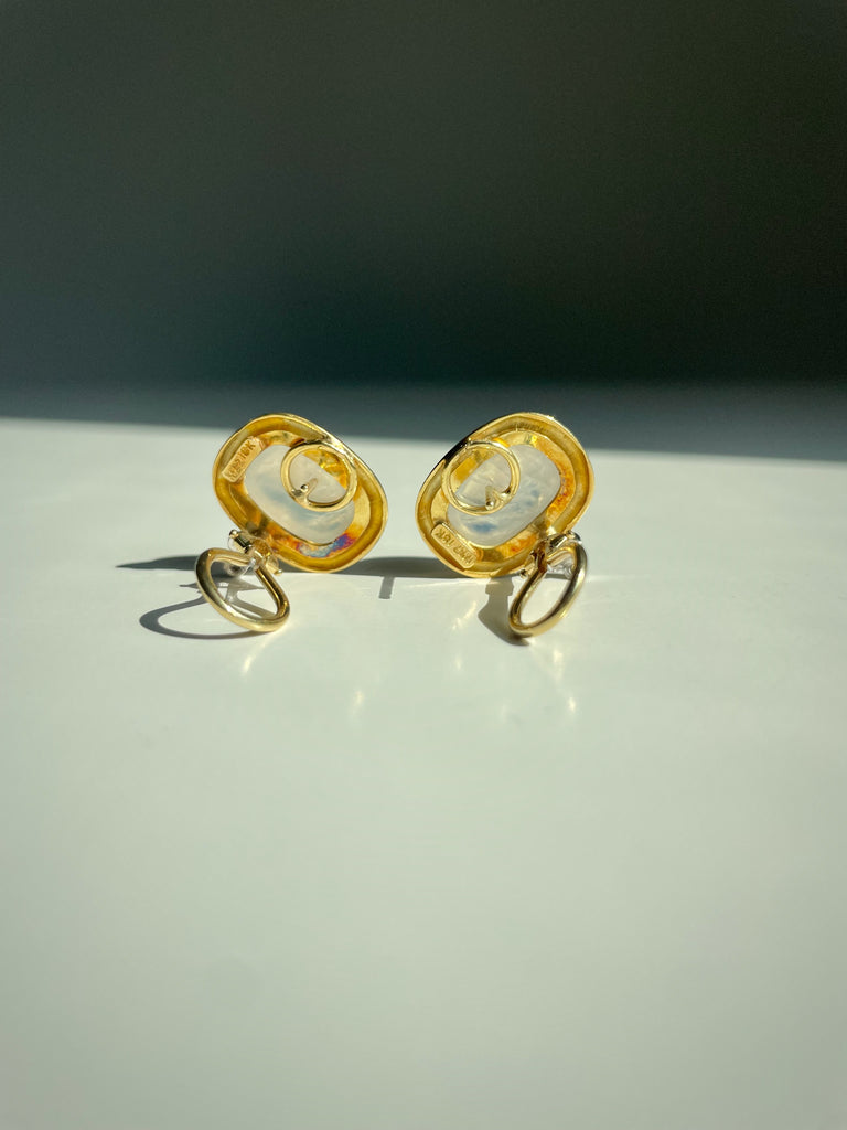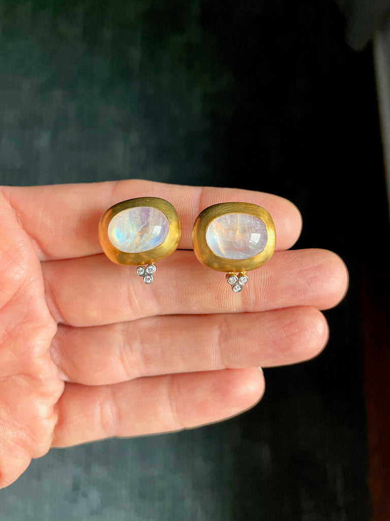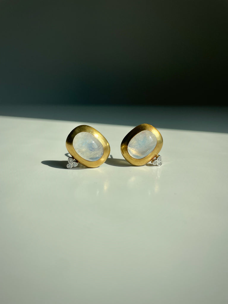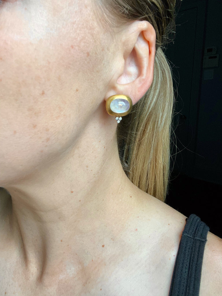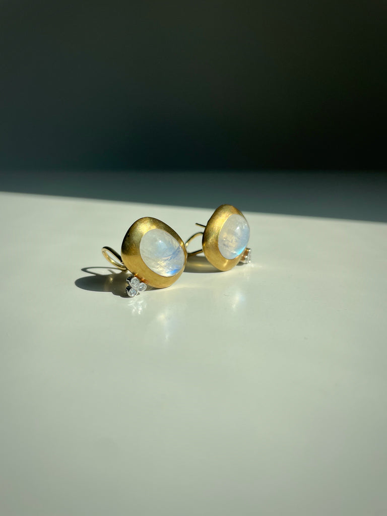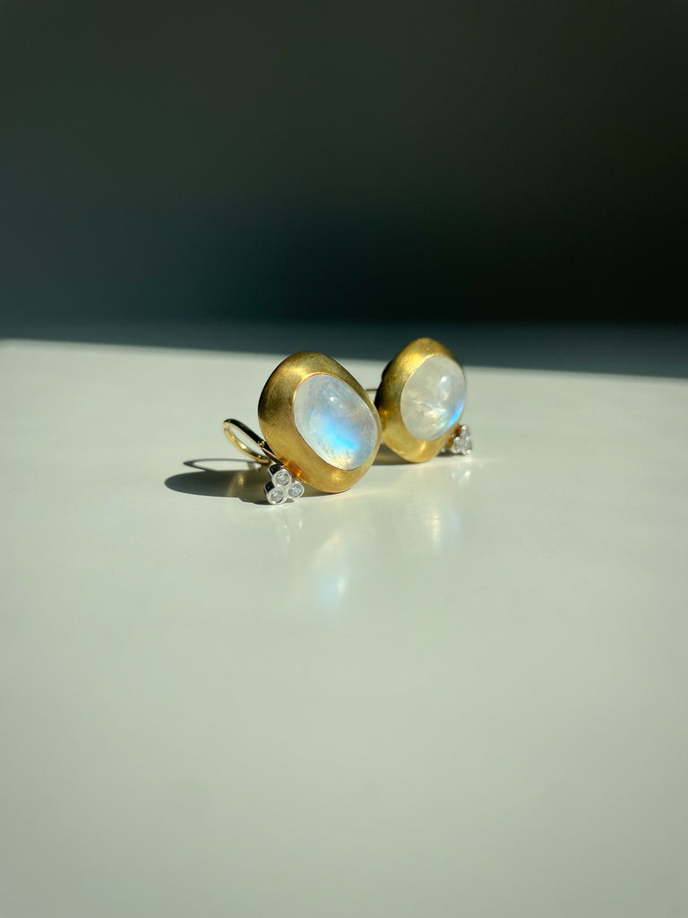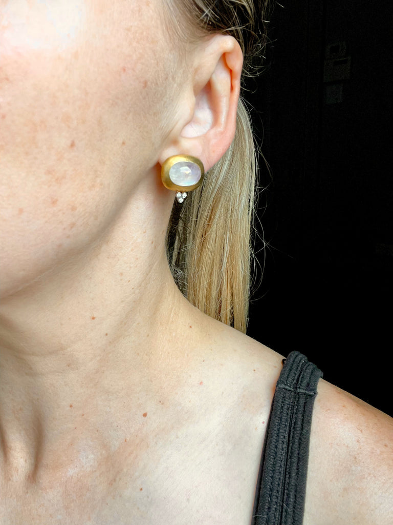 I cannot tell you how excited I was to find these amazing moonstone earrings by the designer Maz. These absolutely incredible earrings feature glowy moonstones set in beautiful 18k yellow gold. Below are three small, sparkling round diamonds in white gold bezel settings. They have omega backs so they are secure on the ear and they are absolutely incredible on. These are absolutely magical!