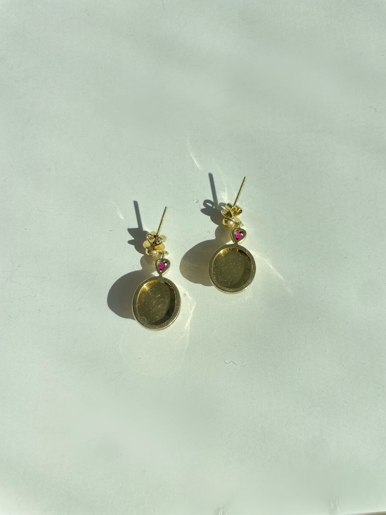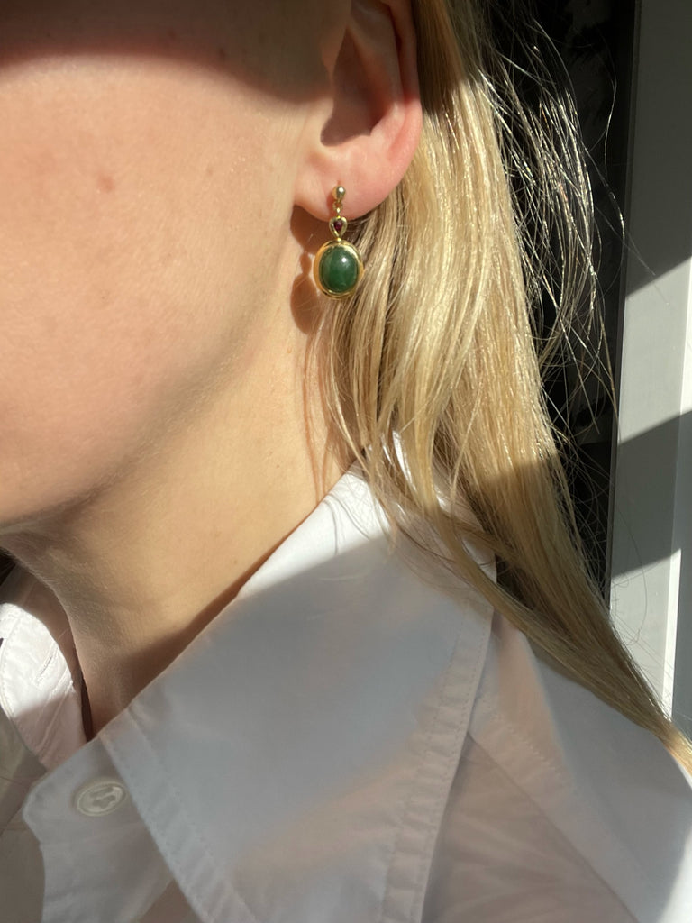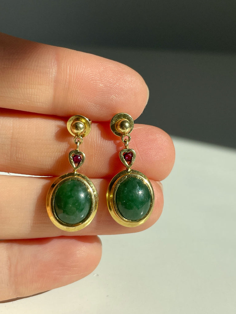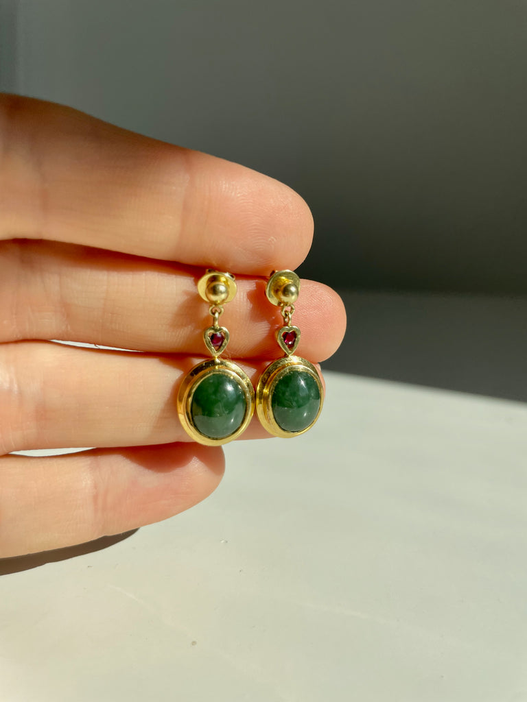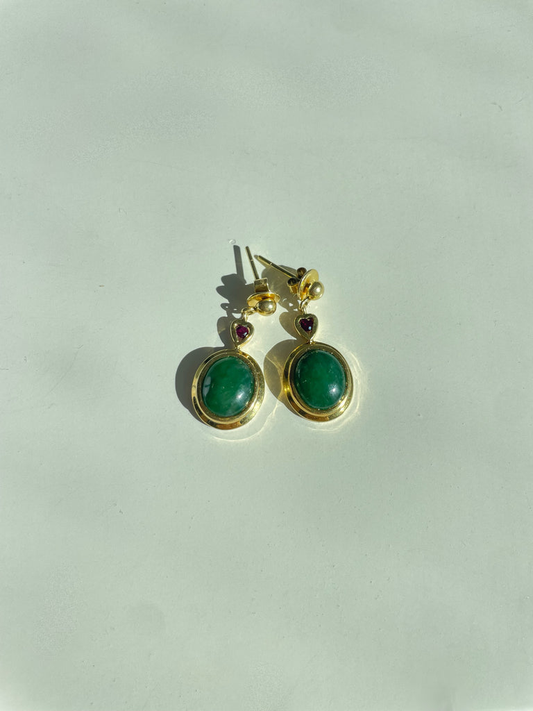 These earrings are simple yet fun! I adore the heart shaped detail, the gorgeous patina and how well it pairs with the jade and ruby. Bonus: the backs are covered as well.