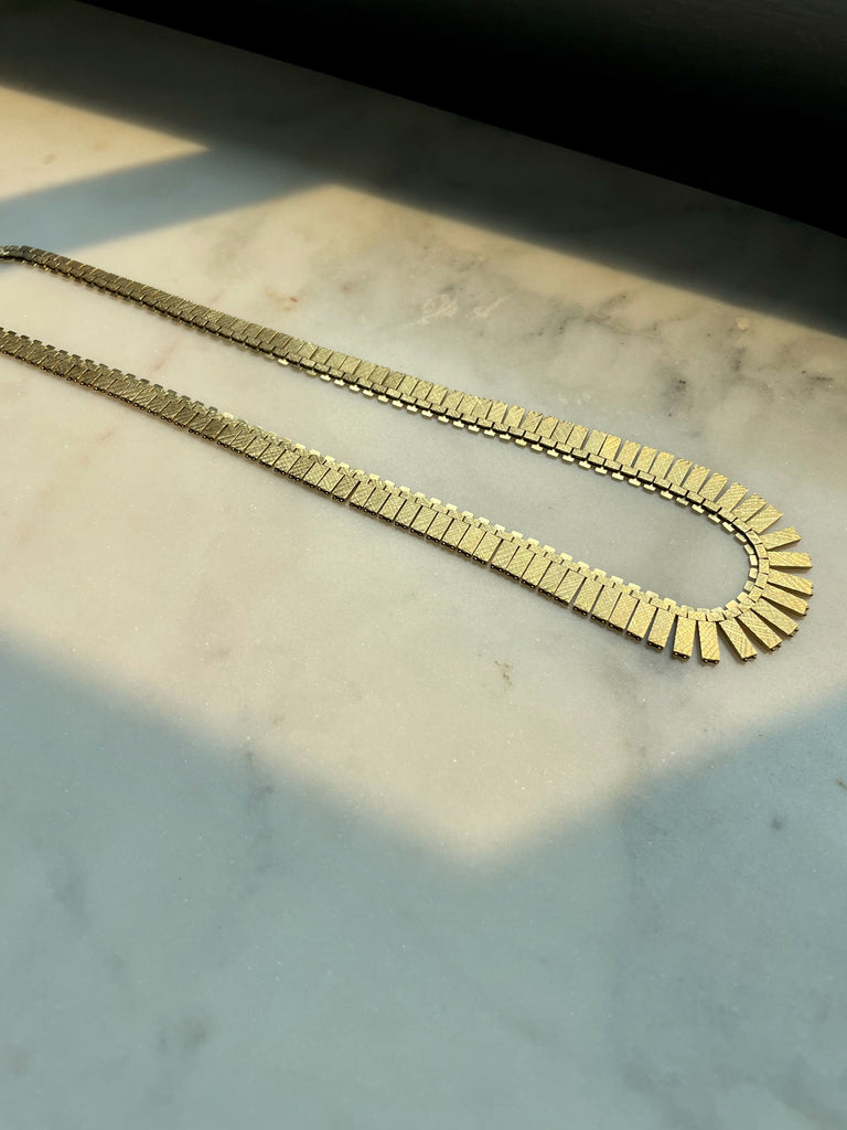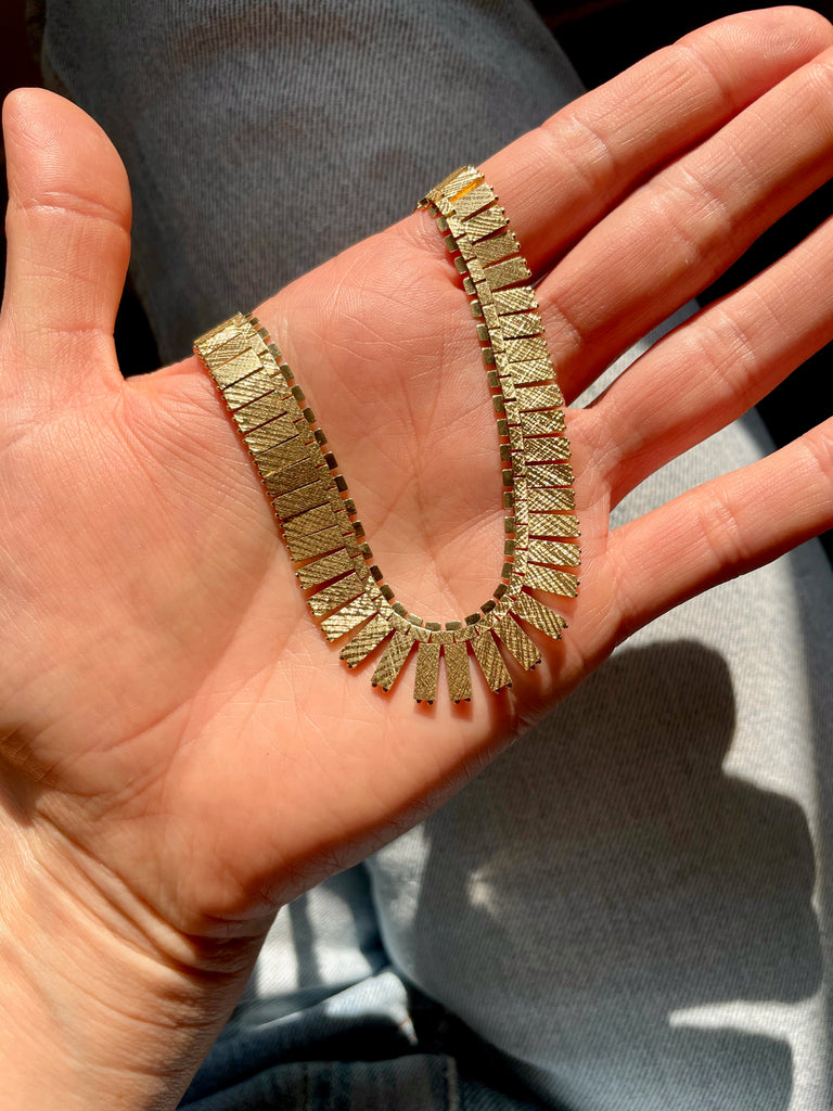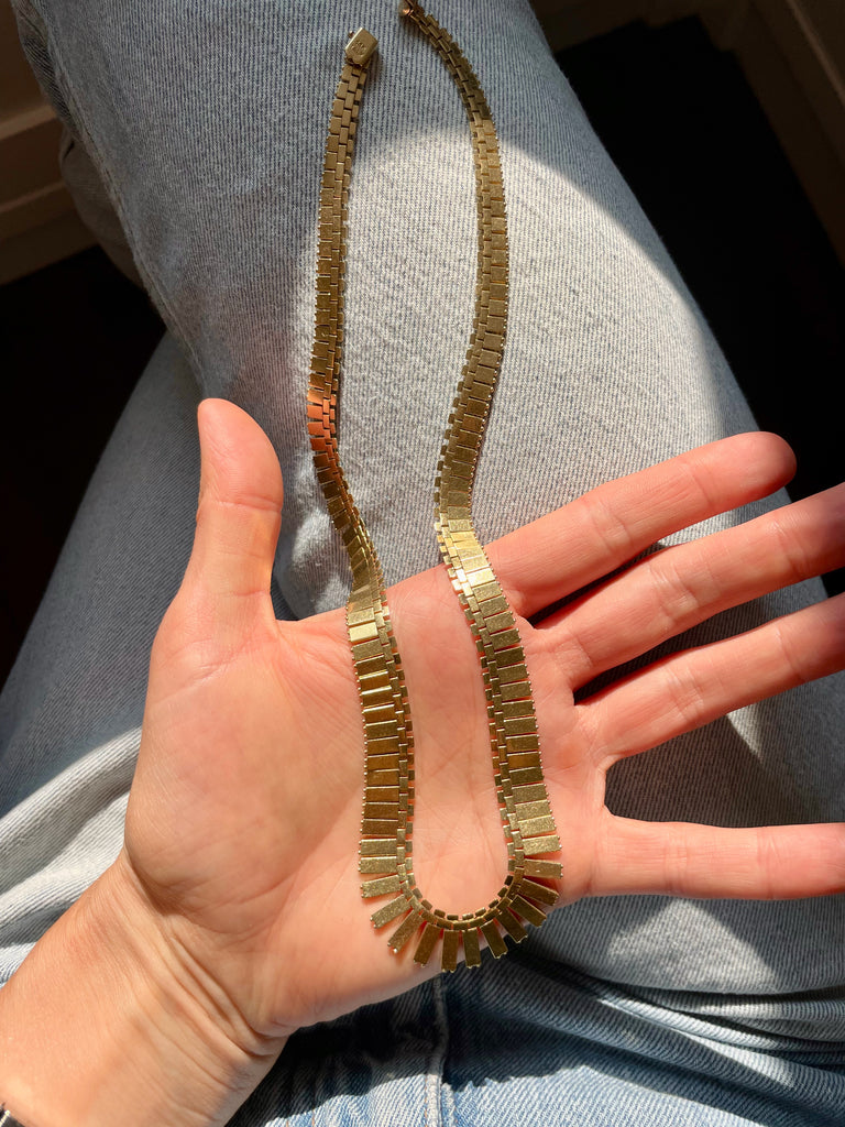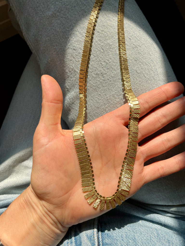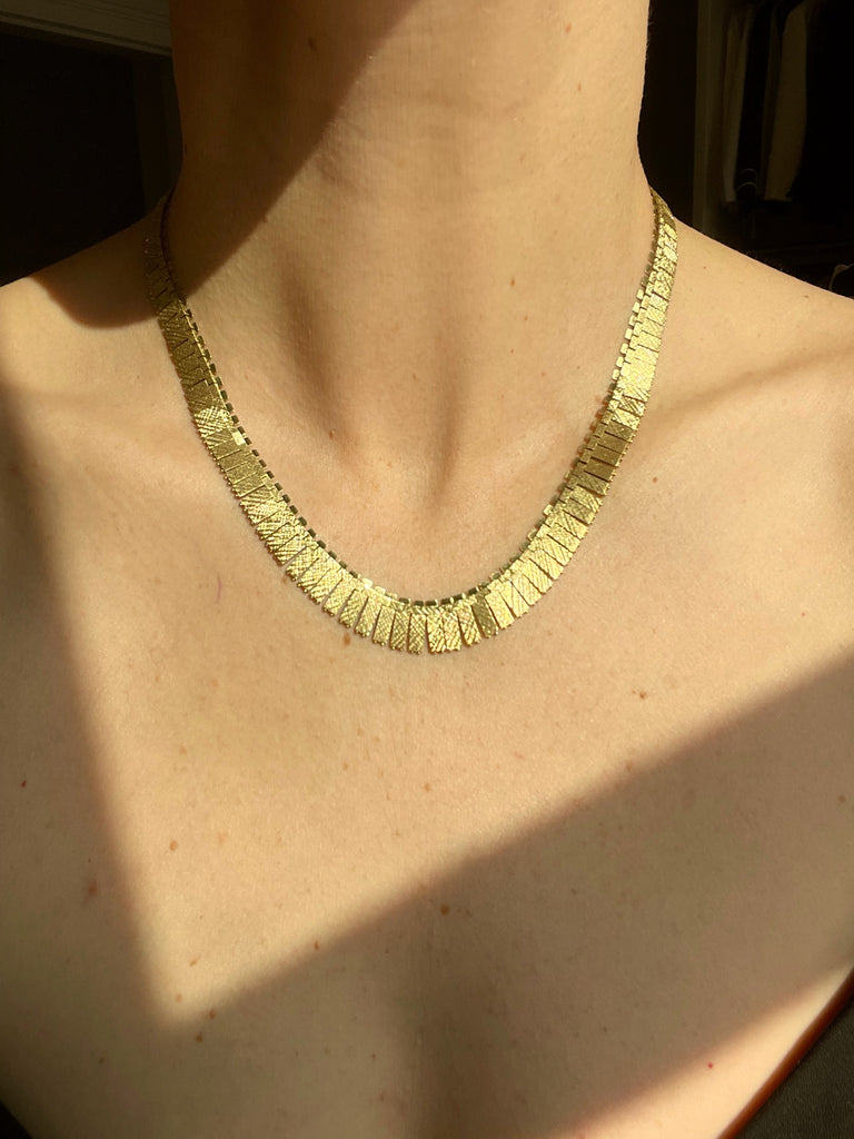 This incredible (and reversible) vintage 14k Cleopatra necklace is a piece you will have and love forever. One side has a polished finish (with a beautiful patina) for when you want to make more of a statement, while the other side has a Florentine finish for the days when you want a more subdued look. Both sides are stunning and I absolutely love the versatility. The details on this one are incredible and the fluidity is absolutely beautiful. You cannot go wrong with this one!