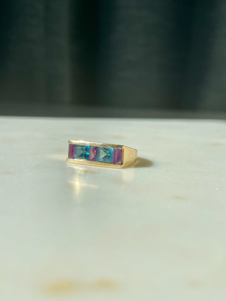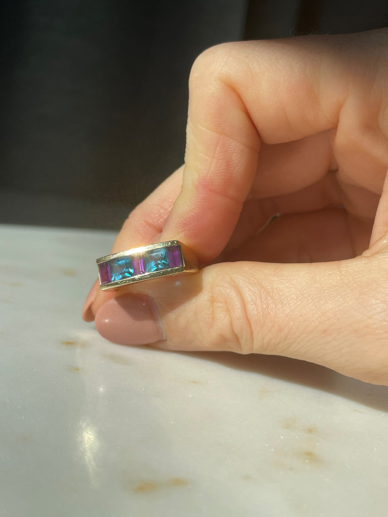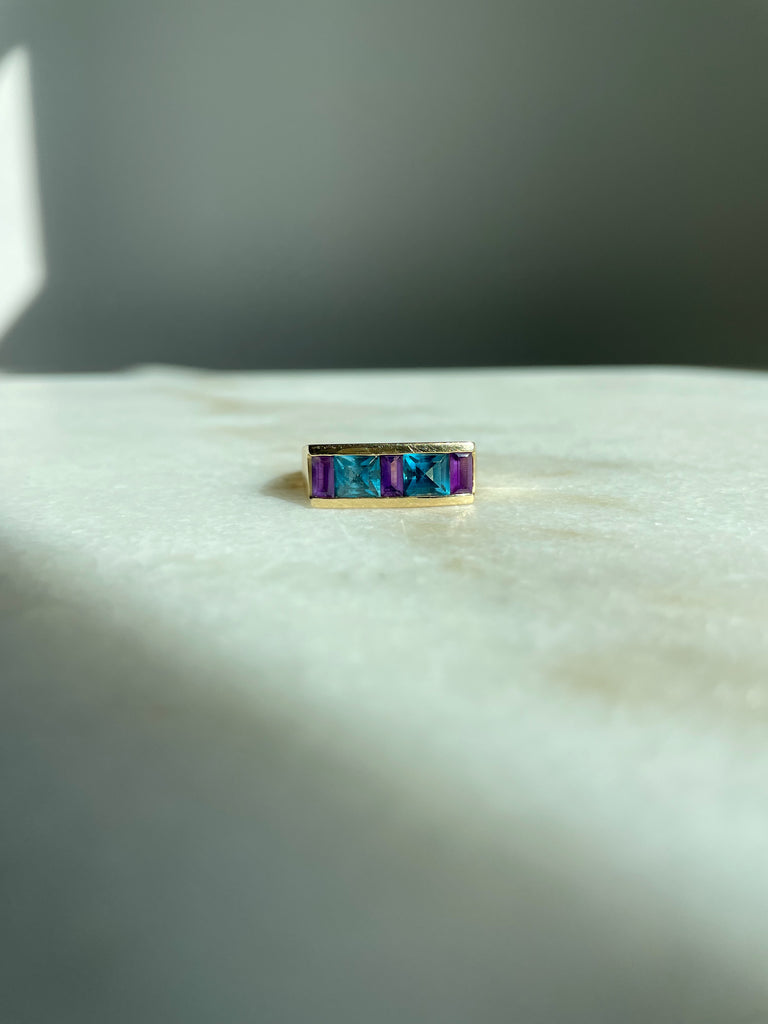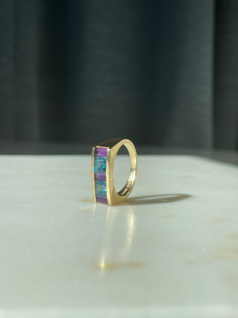 This ring is so fun! It features channel set amethysts and blue topaz surrounded in 14K gold. It is great on its own, stacks nicely and pairs well with other styles. It is a size 8 and is sizable.