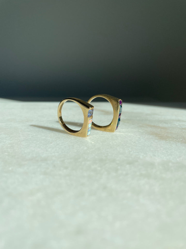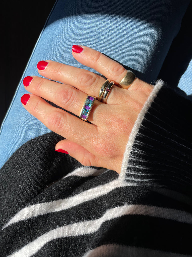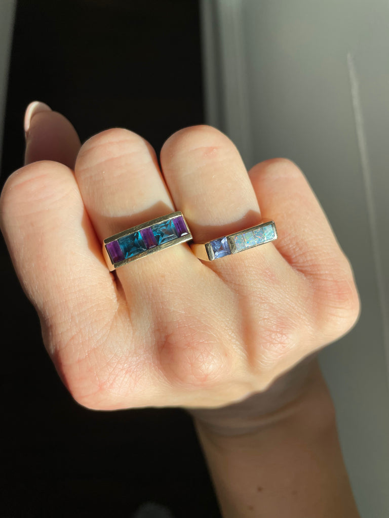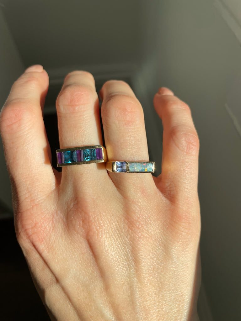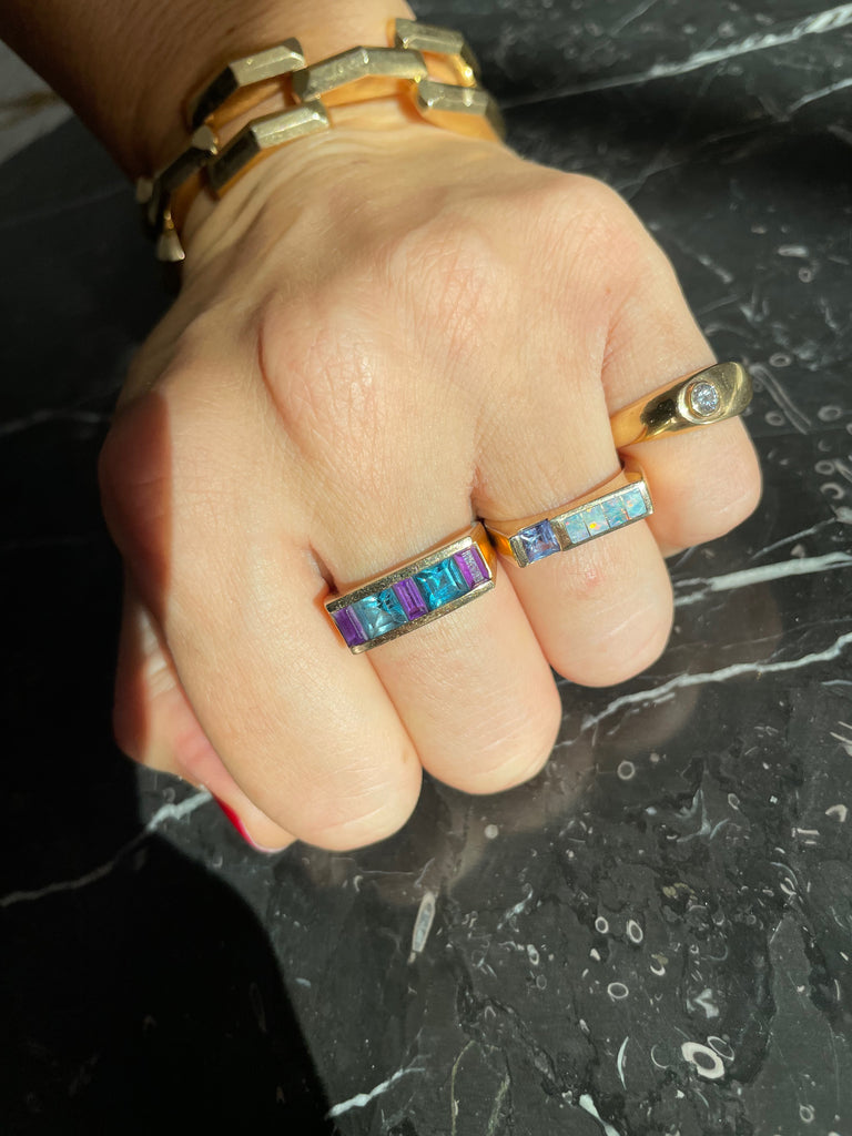 This ring is so fun! It features channel set amethysts and blue topaz surrounded in 14K gold. It is great on its own, stacks nicely and pairs well with other styles. It is a size 8 and is sizable.