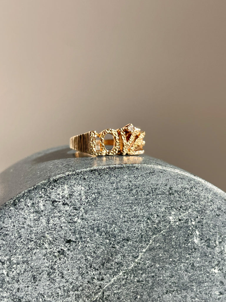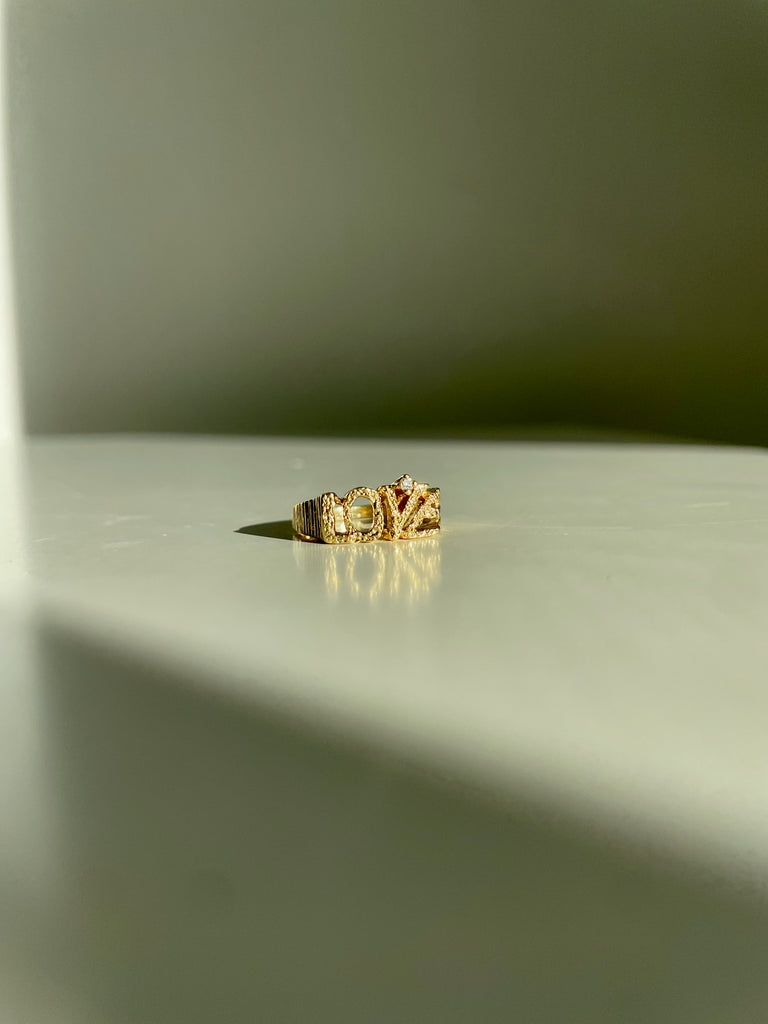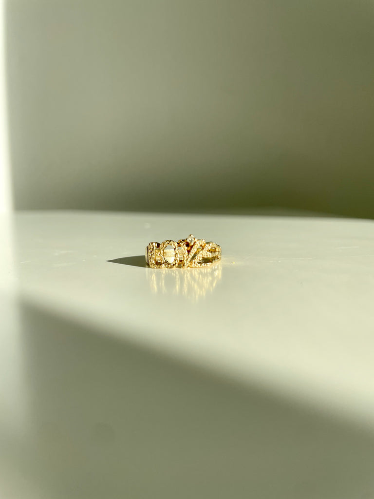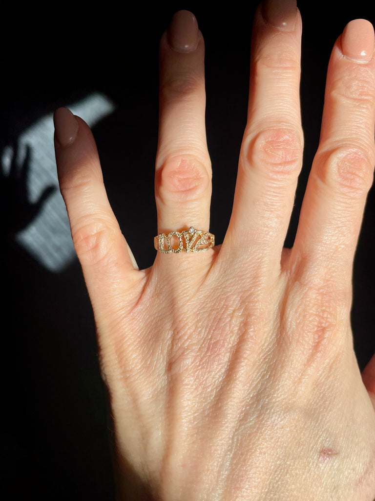 This ring couldn't be cuter - I love the texture, the typography and the diamond! This beauty looks great alone or in a stack and is perfect for anyone who loves love!