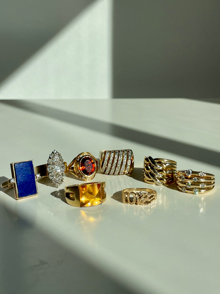 14k, 3.14g, size 5.5 (sizable), the face of the ring measures 7.57mm at the widest point.