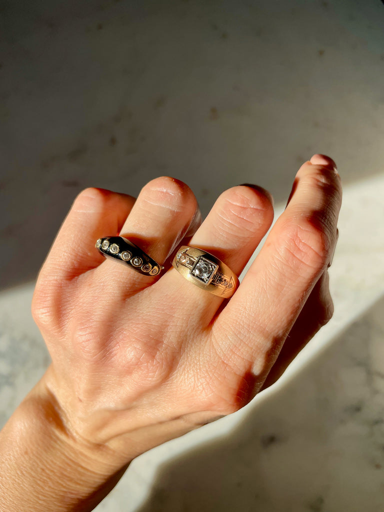 I really love this vintage onyx and diamond ring. It is so unique and really amazing on despite being difficult to photograph. I love the unique shape and the bezel set diamonds. It's a keeper.