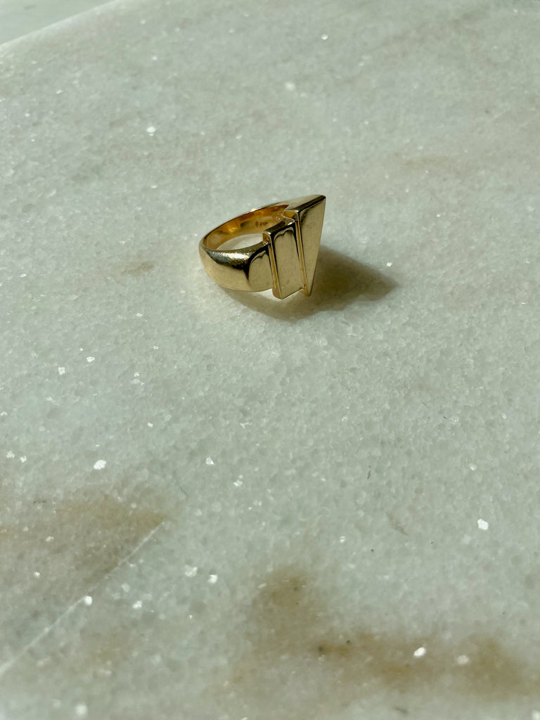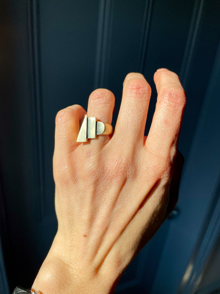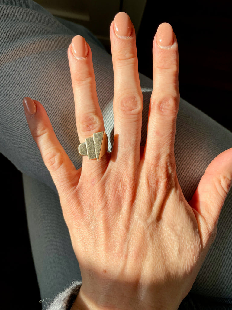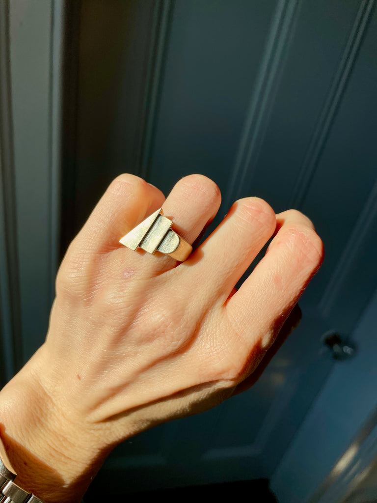 This ring is very unique and modern. The sculptural, stepped geometric shapes make it something to see from every angle. This is an effortlessly cool everyday ring that you won't want to take off.