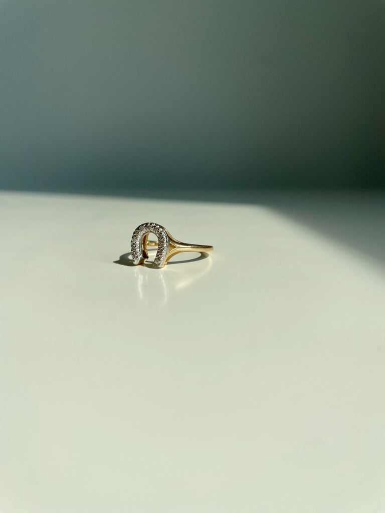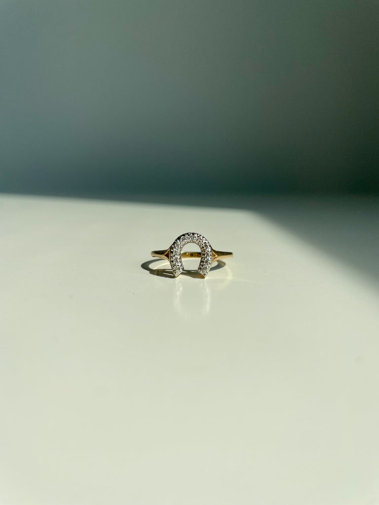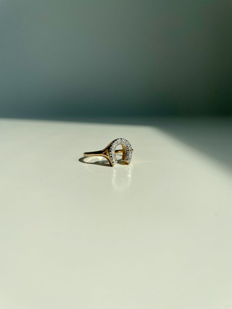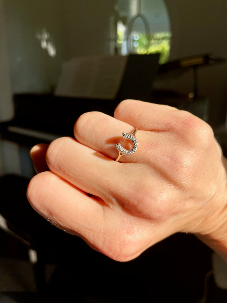 This 14k dainty horseshoe ring will bring you all the luck! It is such a cute piece and I love that the stones are set in white gold. The stones are small, give a nice shimmer to the ring and are likely moissanite.